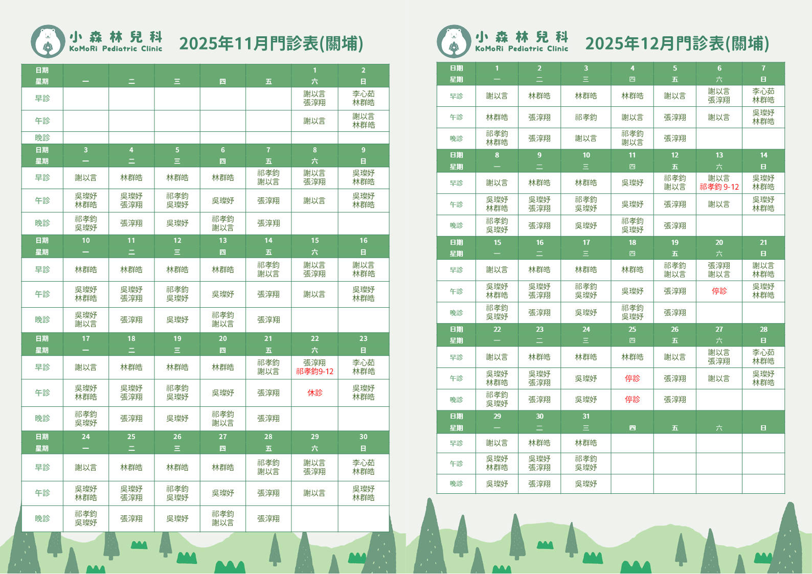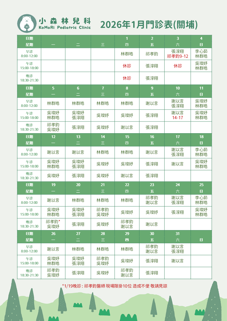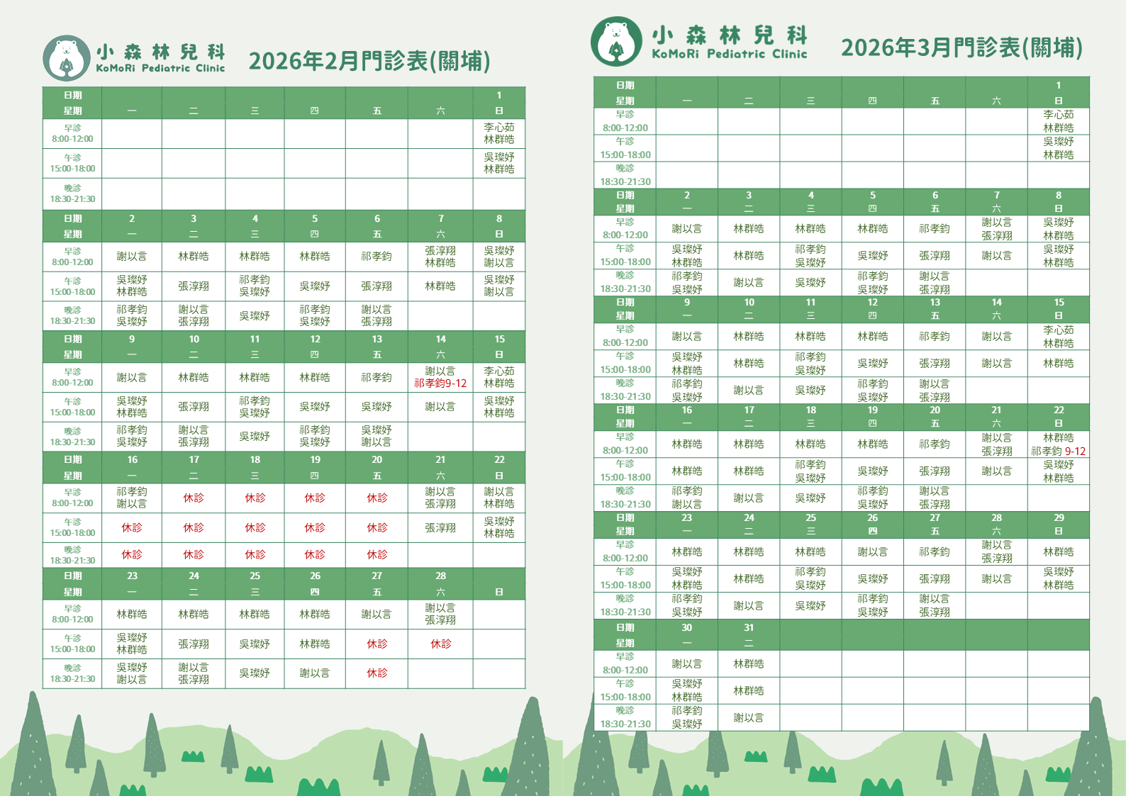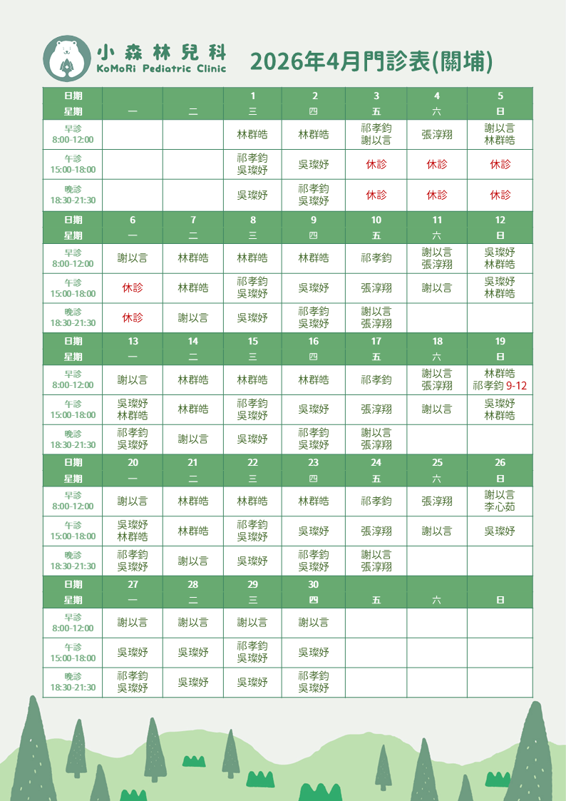 專業兒科醫療團隊全方位護航,成為您的靠山,助孩子健康成長茁壯 小森林日文為こもり(komori),意為「子守」 。